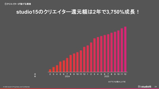 単なる動画の再生数(バズ)を追うだけでなく、クリエイターが持続的に収益を得られる環境を構築した結果、クリエイターへの累計還元額は2024年から2025年末までのたった2年で3,750%を突破いたしました。