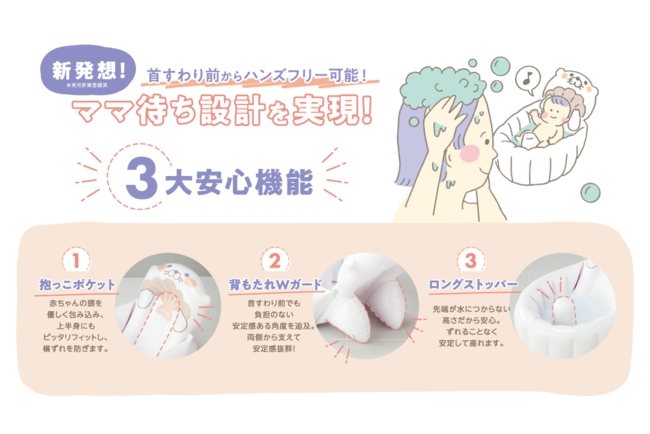 「ママ待ち設計」の3大安心機能があるから、首すわり前からハンズフリー可能!