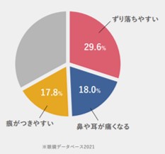 メガネユーザーの3人に1人が【メガネがズレる】、5人に1人の方が【鼻や耳が痛くなる】という“お困り”を抱えています。コロナ禍によって相まった、在宅勤務やデスクワーク、家事の増加でメガネを掛ける機会が増えた昨今、このようなお困りごとは顕著になりました。
