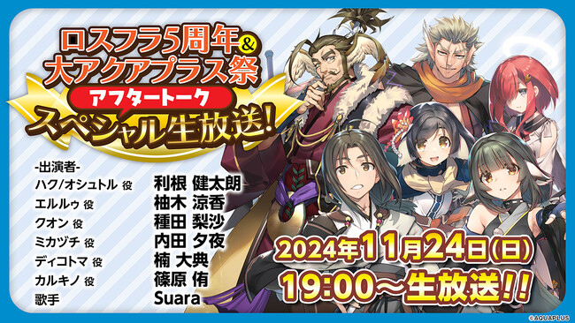 株式会社アクアプラス(以下アクアプラス)は、2024年11月24日(日)19:00より特別番組「『ロスフラ5周年』&『大アクアプラス祭』アフタートーク スペシャル生放送!」を配信いたします。同番組では2024年11月に5周年を迎えるスマートフォン用RPG『うたわれるもの ロストフラグ』の新情報や、先日開催したイベント『大アクアプラス祭』のアフタートークをお届けいたします。