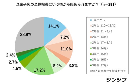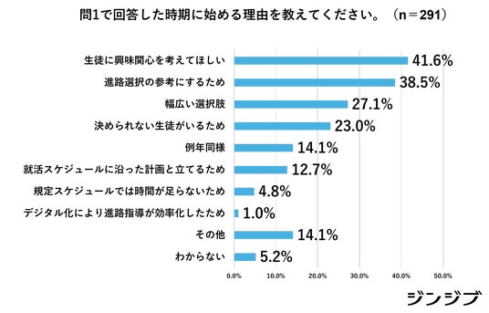 「先生Fes」に参加しアンケートに回答いただいた先生291名に、生徒へ企業研究の指導を始める時期について質問をしたところ、44.3%が「1年生から2年生の頃から開始する」と回答しました。理由として、「生徒に興味関心を考えてほしい(41.6%)」と最も多いことから、先生は早い段階から企業研究を自ら行い、興味関心を持ってほしいと考えていると言えそうです。