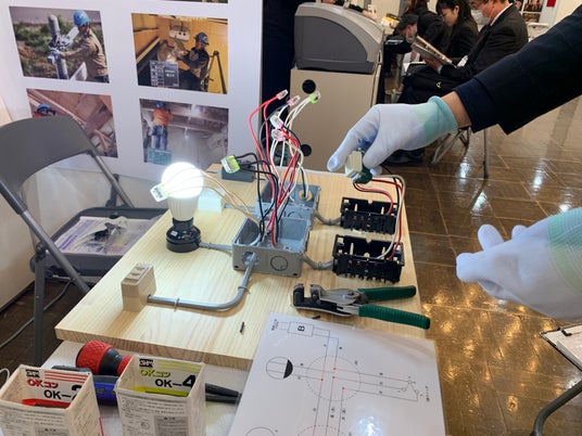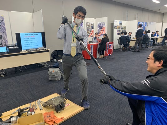 体験では、自動車整備の工具に触れて作業の説明を行いました。普段触れない工具に触れて先生にもお喜びいただけました。