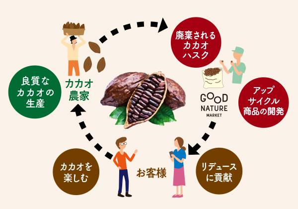 カカオハスクを活用したカカオシリーズは、美味しいだけではなく、アップサイクルの取り組みも大切な目的の一つとしています。ビーントゥバーのチョコレートを作る際、カカオ豆の約30%を占めるカカオハスクは、ほとんど活用されていません。そこで、カカオハスクに価値を見出したアップサイクルな商品を開発しています。その商品をご利用いただくことで、リデュース(無駄なごみの量をできるだけ少なくすること)に貢献。カカオを丸ごと仕入れることで、良質な生産にも繋がると考えます。