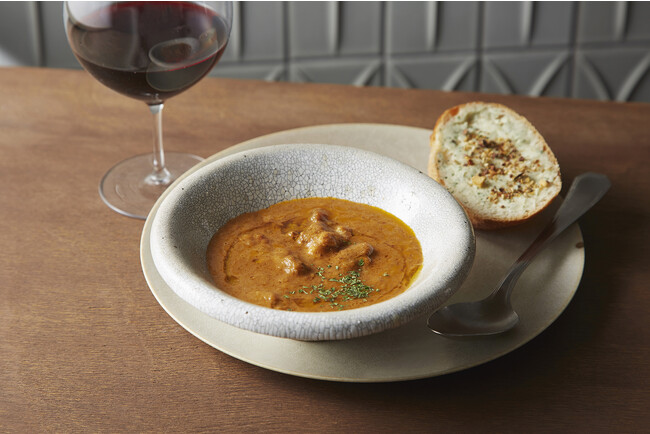 オリジナル商品の本格ビーフカレー。トマトをベースにゴルゴンゾーラのコクが加わったクリーミーな味わいで、ごろごろ入った国産黒毛和牛のすね肉がうれしい贅沢な一品。ニンニクが利いたガーリックトーストをディップしてお召し上がりください。