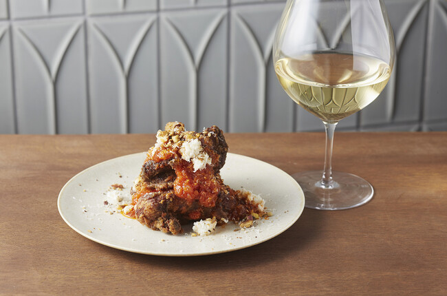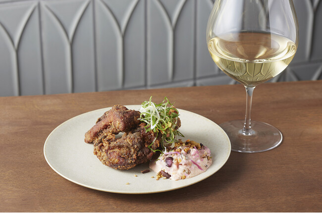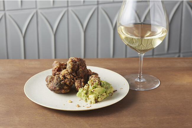鶏もも肉の唐揚げは、通常は廃棄されてしまうホエイ※を使用することで肉の旨味と甘みを引き出したジューシーな一品です。また、整腸作用のある竹炭パウダーを使用することで油によるもたれを軽減。上にはぶどう山椒やスパイス、ナッツ、カカオハスク(カカオ豆の皮)などをブレンドした、オリジナル商品のデュカ、「アラビアン ナッツ&スパイス」をトッピング。ソースは3種類ご用意しています。