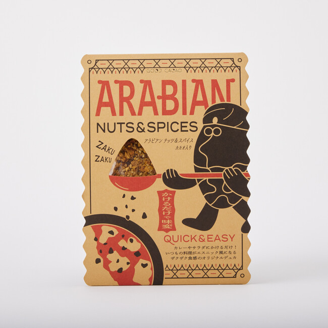 「アラビアン ナッツ&スパイス」には、ぶどう山椒やごまなど、「 和 」を感じさせる素材を使用し、独自にアレンジ。カレーやサラダにかけるだけで、料理のマンネリ化を解消し、味わいや旨みを引き出します。隠し味としてカカオハスク(カカオ豆の皮)やみかん果皮(陳皮)もブレンドしており 、 通常捨てられてしまう素材をアップサイクルした地球にも優しい調味料です 。