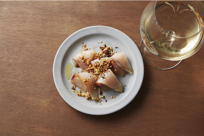 そのままでも美味しい魚の旨味を、「冷温熟成」によって極限まで引き出した極上の熟成刺身です。オリーブオイルとオリジナル商品のデュカ「アラビアン ナッツ&スパイス」でシンプルに味付けしています。