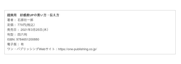 株式会社 ワン・パブリッシング(東京都台東区/代表取締役社長:廣瀬有二)は、『超実用 好感度UPの言い方・伝え方』を3月25日(木)に発売いたしました。『大人養成講座』をはじめ、大人としてのコミュニケーションのあり方と実践的な知恵を発信しつづけている石原壮一郎氏による、いまの時代に即したコミュニケーションの指南本です。