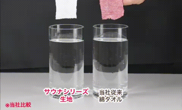 左の一般的な綿タオルを比べると差は一目瞭然!約1秒で下へと落ち、水に落とした瞬間に水分を吸収します。