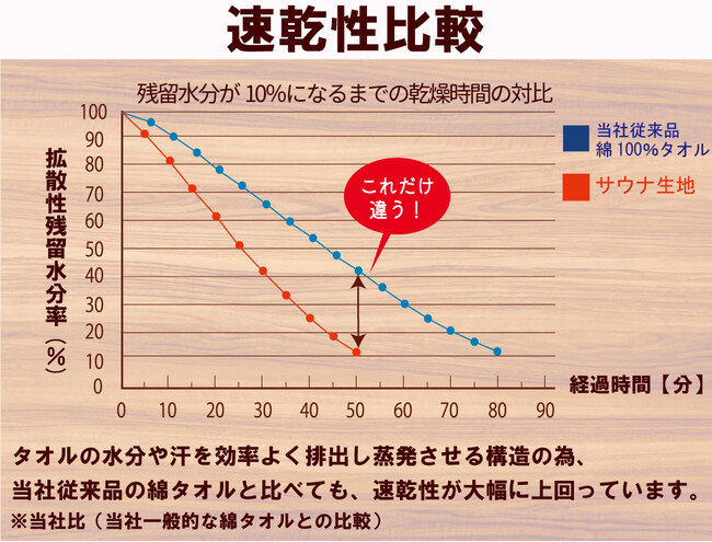 タオルの水分や汗を効率よく排出し蒸発させる構造の為、当社従来品の綿タオルと比べても、速乾性が大幅に上回っています。※当社比(当社一般的な綿タオルとの比較)