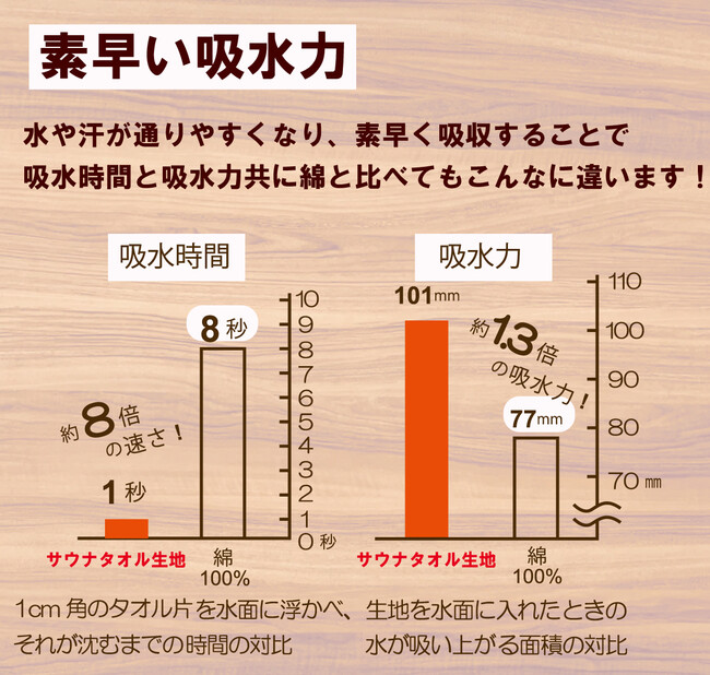 当社の従来品の綿100%のタオルと比較しても、約8倍の吸水スピードとなっており、さらに吸水力については当社従来品の綿タオルの1.3倍を実現!※当社比(当社一般的な綿タオルとの比較)