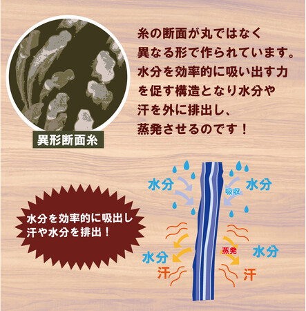 水分を効率的に吸って蒸発する糸を使用。約8倍のスピードで吸水して、すぐに乾く!