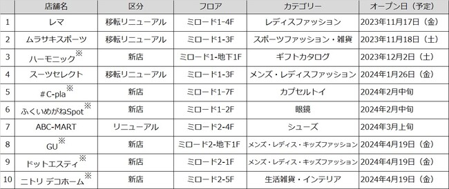 そのほか2023年11月17日(金)にはレディスファッションの「レマ」が先行リニューアルオープン。2024年3月上旬にシューズ専門店の「ABC-MART」が改装オープンいたします。