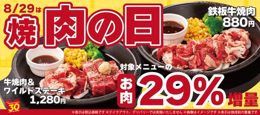 株式会社ホットパレット(本社:東京都江東区、代表取締役社長:松本純男)が展開するペッパーランチは、2024年8月29日(木)の「焼(8)肉(29)の日」にちなんで、8月29日(木)から9月1日(日)までの4日間、焼肉メニューのお肉を29%増量し、販売いたします。