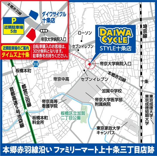 ダイワサイクルSTYLE十条店は、本郷赤羽線沿い、ファミリーマート上十条三丁目店跡に開店いたします。JR埼京線 十条駅から徒歩10分、帝京大学のすぐ近くに位置しており、通勤通学や、通院などの際にお立ち寄りいただきやすい立地となっております。空気入れ・お困りごとなどありましたらお気軽にお立ち寄りください。