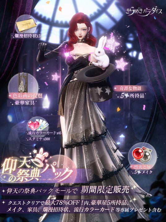 パックには、星5所持品『奇譚な物語』、星5メイク『烈火と灰』、豪華家具『色彩画の琵琶』など、豪華報酬が盛りだくさん。特に星5所持品は、専用動作ポーズを楽しむことができますので、ぜひゲーム内でチェックしてくださいね。