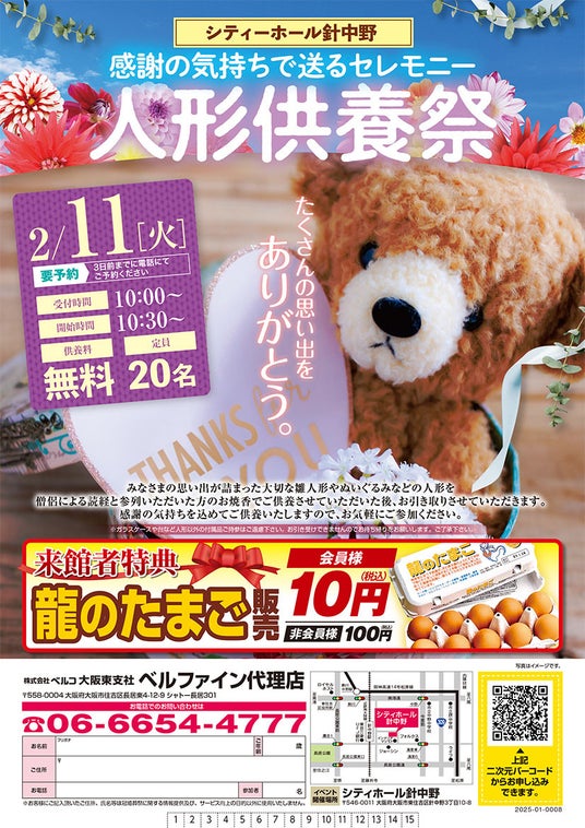 様々な定期イベントを主催し、地域社会との関係構築に取り組む株式会社ベルコでは「シティホール針中野」にて、2025年2月11日(火)に「感謝の気持ちで送るセレモニー 人形供養祭」を開催します。このイベントでは、大切な思い出が込められた人形やぬいぐるみへ感謝の気持ちを持って供養することとをから、「モノを大切にする」精神を広めることを目指しております。