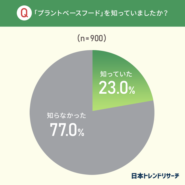 「知っていた」と回答したのは23.0%で、77.0%と多くの方は「プラントベースフード」を「知らなかった」と回答しました。