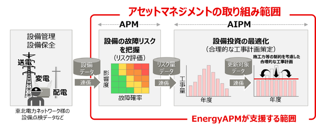 当社は、ガイドラインで定められた設備の故障リスクを把握するAPM(Asset Performance Management)、および設備投資の最適化を行うAIPM(Asset Investment Planning and Management)の機能を持つ「EnergyAPM」を用いて、東北電力ネットワーク様が目指すアセットマネジメントの取り組みを支援し、社会インフラの安全性の維持と電力の安定供給に貢献します