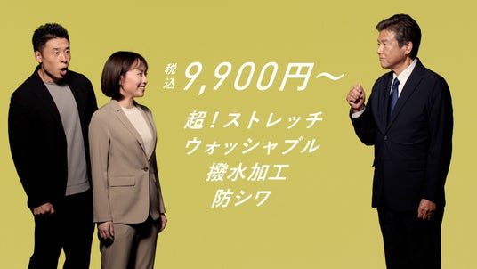 今回のCMでは、石川さんが新たに発売する「ゼロプレッシャースーツ」レディススタイルを着用し、ストレッチ性やウォッシャブル機能、価格(税込9,900円~)の魅力を発信する内容となっています。スーツをさっそうと着こなす三浦さん、きんに君さん、石川さんのキャラを活かした軽妙なトークと笑いありのCMとなっております。