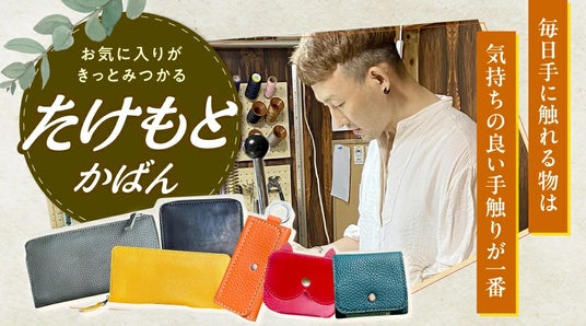 だからこそ『価格・品質・手触り』3点のバランスが高水準なイタリア産のアドリア牛革を使用。「たけもとかばん」の代名詞として、財布、鞄(かばん)、キーケースなどさまざまなラインナップで展開してきました。