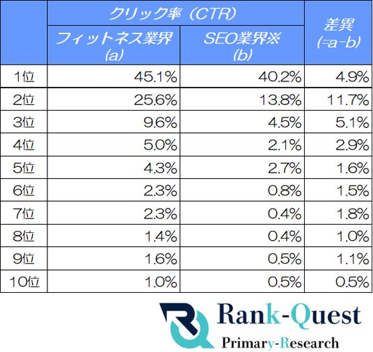 本調査では、検索結果の上位10位に入っている3,626件のフィットネス関連キーワードを対象に、順位ごとのCTR変動を徹底分析。さらに、ランクエストが運用するSEO業界向けメディア(注2)のクリック率データと比較することで、フィットネス業界に特化したクリック傾向を明らかにしています。