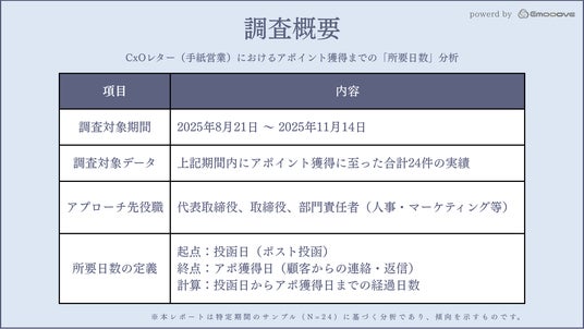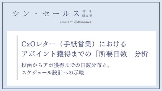 新時代の営業手法を提案する株式会社Emooove(本社:東京都品川区、代表取締役CEO:藤澤諒一)は、同社が運営するオウンドメディア「シン・セールス総合研究所」において、決裁者向けCxOレター(手紙営業)における「アポイント獲得までの所要日数」に関する分析レポートを公開しました。