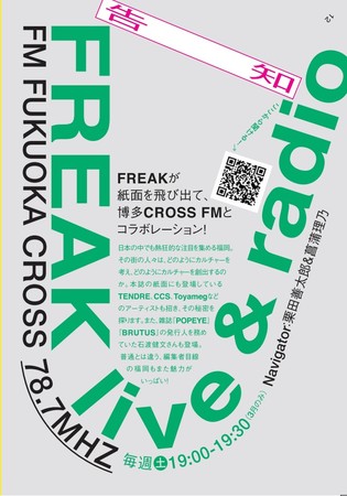 「FREAK」が紙面を飛び出し、初となるラジオ放送が決定しました。番組では音楽シーンで様々な活躍をする「TENDRE」や、九州出身の4人組HIP HOPグループ「週末CITY PLAY BOYZ」、福岡在住のイラストレーター「Toyameg」など、ローカルマガジンやオンラインライブ出演のアーティストがゲストとして登場します。また人気ファッション&カルチャー誌『POPEYE(ポパイ)』とポップカルチャーの総合誌『BRUTUS(ブルータス)』の発行人を務めていた石渡健文氏に、エディターとして県外から見た福岡の魅力をお聞きして、ローカルマガジンの裏側をさらに掘り下げていきます。