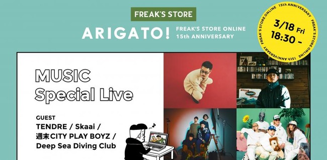 FREAK'S STORE ONLINE 15周年記念のオンラインライブに、「FREAK FUKUOKA ISSUE」に登場するアーティストたちが出演!TENDRE/Skaai/週末CITY PLAY BOYZ/Deep Sea Diving Clubをお招きしライブ演奏をしていただきます。ここでしか聞くことのできないマッチアップと特別なセッションも!シークレットゲストも出演予定です。