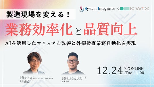 株式会社システムインテグレータ(本社:さいたま市中央区、代表取締役社長:引屋敷 智、東証スタンダード:証券コード3826)は、株式会社クイックス(本社:愛知県刈谷市、代表取締役:岡本 泰)と共催で「製造現場を変える!業務効率化と品質向上」と題した無料ウェビナーを、2024年12月24日(火)に開催することをお知らせします。