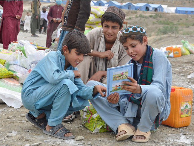 アフガニスタンでは各地に数多くの地雷や即席爆発装置が存在しており、今回の地震の被災地でも被害が生じる危険があります。AARは、独自に作成した地雷回避教育のメッセージが付いたノートやリーフレットを支援物資とあわせて配付し、受け取った子どもたちは真剣にノートを見ていました。