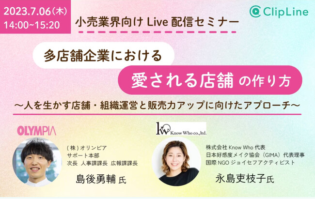 多店舗展開ビジネスの経営課題を可視化し、解決策の実行まで一気通貫でサポートするプラットフォーム「ClipLine(クリップライン)」を提供するClipLine株式会社(本社:東京都千代田区、代表取締役社長:高橋 勇人、以下「当社」)は、2023年7月6日(木)14:00より小売業界向けLiveセミナー『多店舗企業における「愛される店舗」の作り方~人を生かす店舗・組織運営と販売力アップに向けたアプローチ~』を開催いたします。