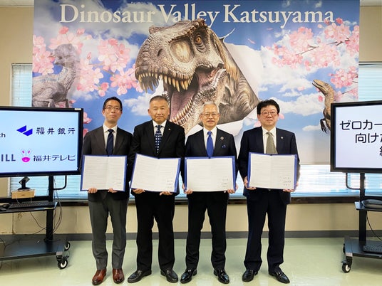 日本全国47都道府県のカーボンニュートラル実現を目指す株式会社バイウィル(本社:東京都中央区、代表取締役社長:下村 雄一郎、以下「バイウィル」)は、株式会社福井銀行(本店:福井県福井市、代表執行役頭取:長谷川 英一、以下「福井銀行」)、福井テレビジョン放送株式会社(本社:福井県福井市、代表取締役社長:酒井 美樹男、以下「福井テレビ」)との3社で、福井県勝山市(市長:水上 実喜夫、以下「勝山市」)と、カーボンニュートラルの実現を目的とした連携協定を締結しました。本協定をもとに、バイウィル、福井銀行、福井テレビの3社は、勝山市におけるJ-クレジット(*1)をはじめとした環境価値の創出への協力や、新たなビジネスモデルの創出などを通じて、勝山市のカーボンニュートラル実現に貢献します。