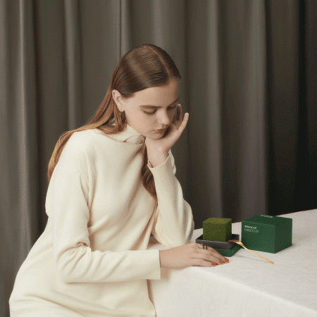 一からデザインしたパッケージは、マッド加工された表面に金箔の箔押し加工を施すことで、『カレ・オ・ショコラ』が持つ繊細さを表現しつつ、ラグジュアリーで重厚感のあるノーブルな世界観を表現しました。ジュエリーボックスを開けたときの驚きのように、箱を開けた瞬間に幸福感を感じて欲しいと言う思いからジュエリーボックスをイメージしたデザインに仕上げました。