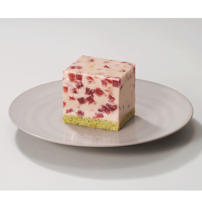 「古都華」特有の香りとリンクするよう選んだのは、埼玉県深谷市にあるROSE LABOが栽培するルージュロワイヤルという品種のバラ。香りを煎じたローズシロップで、苺のコンポートを作ります。ベースとなるガナッシュは、ルビーチョコレートを使うことで自然由来の淡いルビー色に。発酵バターや発酵サワークリームによる心地よい酸味で、上品な甘さに仕立てました。ピスタチオを贅沢に使ったビスキュイの土台が、苺に寄り添います。