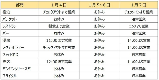 フェニックスリゾート株式会社(宮崎市:代表取締役 社長執行役員 片桐孝一)が運営する、フェニックス・シーガイア・リゾートは、2023年1月4日(水)~1月6日(金)の3日間を「全施設一斉休館日」とさせていただきます。