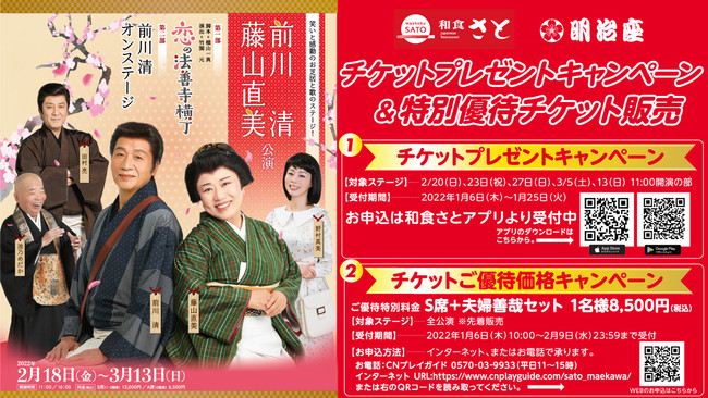 国内206店舗を展開する「和食さと」では、さとアプリをダウンロードされているお客さまへの限定企画として、明治座「前川清・藤山直美 公演」のチケット(S席:13,000円/席)を合計5組10名様へプレゼントするキャンペーンを1月6日(木)~1月25日(火)で開催します。