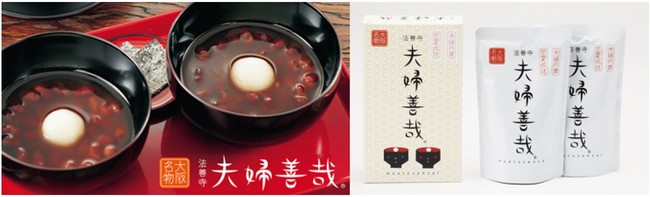 「夫婦善哉」は大阪法善寺横丁の名物で、その名から想像頂ける通り、カップルで食べると円満になれるという「縁起物」のぜんざいです。それぞれ二椀ずつを召し上がって頂くのが昔ながらの食べ方で、惹かれ合う二人が食べると、恋愛が成就すると言われています。