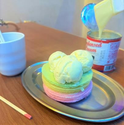 関西方面の縁日の定番といえば、ミルクせんべい!くじを引いて色によって重ねる枚数が決まります。さくさくの軽い食感のせんべいに、練乳をたっぷり塗って重ねていき、シンプルながら甘さと食感が癖になる楽しさです。