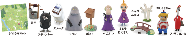 本シリーズにはムーミン一家を中心に、全8体の代表的なムーミンキャラクターのフィギュアが付属。第1回のお届けでは主人公の「ムーミントロール」と「スナフキン」のフィギュアが登場します。ハウスに飾れば、ムーミンの世界観をよりかわいらしく表現することができます。また、「スティンキー」や「ミムラねえさん」など、日本でも人気のキャラクターフィギュアも登場(別売り)。主要キャラクターたちをすべて集めれば、より一層シリーズが楽しめます。