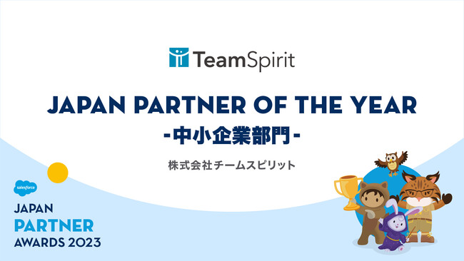 働き方改革プラットフォーム「TeamSpirit」シリーズを開発・提供する株式会社チームスピリット(代表取締役:荻島 浩司、 以下 チームスピリット)は、2023年4月13日、Salesforce Japan Partner Award 2023における、Growth部門 ビジネス・ユニットカテゴリー 「Japan Partner of the Year -中小企業部門-」を受賞しました。Salesforceの製品・サービスを活用して顧客のビジネス革新に貢献するとともに、セールスフォース・ジャパンのビジネス発展に寄与したパートナーに贈られる賞で、この度の受賞は、チームスピリットが中小企業を対象とする市場で秀でた功績を出したことが評価されました。