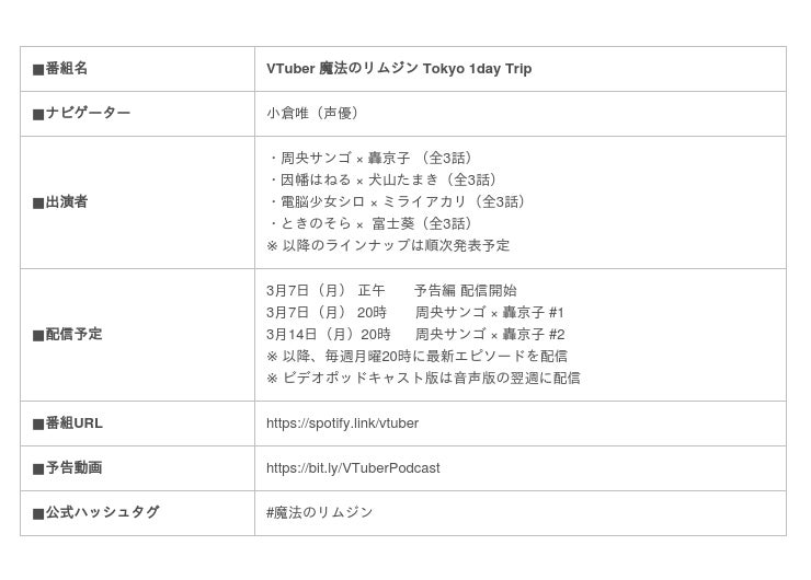 世界で 4億600万人以上のユーザーが利用するオーディオ ストリーミングサービス Spotify(会社名 Spotify AB / 本社 Stockholm, Sweden)は、インターネット上などで2DCGや3DCGで描かれたキャラクターやアバターを用いて動画投稿や生放送を行い、国内だけでなく海外でも人気を集めるクリエイター VTuberが、音声だけで新たなエンタテインメントに挑戦する、Spotifyオリジナルポッドキャスト番組『VTuber 魔法のリムジン Tokyo 1Day Trip』を、本日3月7日より配信いたします。