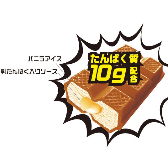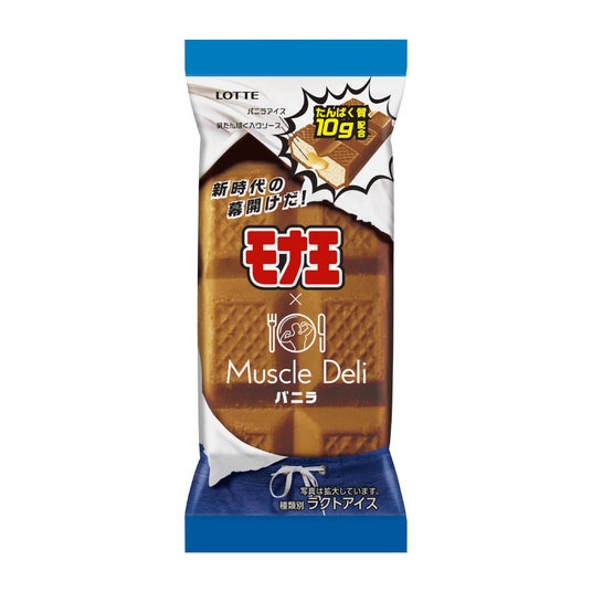 すべてのパーツにタンパク質を配合したバニラ味のモナカアイスが新登場。「モナ王」として初めて、アイス内部にソースを注入。通常の「モナ王 バニラ」と比べて約2.3倍のタンパク質!数量限定で販売。