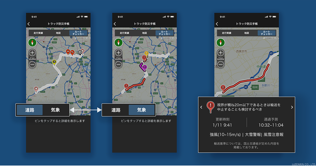 ルート上で国土交通省通達の輸送の目安に当たる区間を、視覚的に表示します。そのエリアに出ている雨量と風速の予測値、気象警報・注意報情報の発表時刻と詳細、通過予定時刻と共に、該当する異常気象時の措置の目安をテキストで表示します。2019年1月提供開始の、道幅・高さ・角度を自動計算し、通過に注意が必要なポイントを地図上に表示する「ルートチェッカー」機能を拡張したもので、ボタンを押して切り替えることができます。
