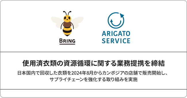 株式会社JEPLAN(代表取締役 執行役員社長:高尾 正樹、以下「JEPLAN」)は、国内外で古着販売を行う株式会社ありがとうサービス(代表取締役最終経営責任者:井本 雅之、以下「ありがとうサービス」)と、使用済衣類の資源循環に関する業務提携を締結しました。この度、初の取り組みとしてBRINGのプラットフォームを通じて日本国内で回収した衣類を、2024年8月にオープンしたありがとうサービスのグループ会社が運営するカンボジアの古着販売店で販売し、サプライチェーンを強化する取り組みを実施していきます。