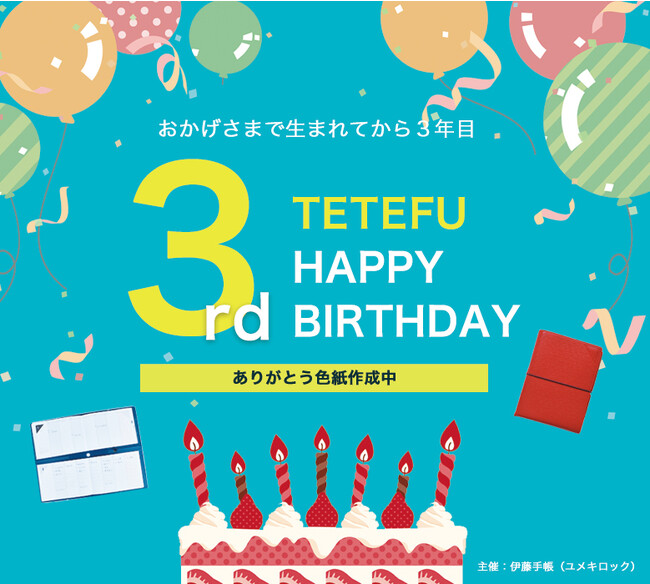 手帳製造・OEMを手がけて69年の伊藤手帳株式会社(本社名古屋市:代表取締役社長 伊藤 亮仁 以下伊藤手帳)は、自社ブランドユメキロック商品である折り畳める手帳「TETEFU」の3歳お誕生日お祝い企画を発表します。