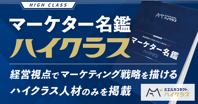 今回の新サービス「ミエルカコネクト ハイクラス(https://mieruca-connect.com/series/highclass/)」のローンチ記念として「マーケター名鑑-ハイクラス-」を発行いたしました。