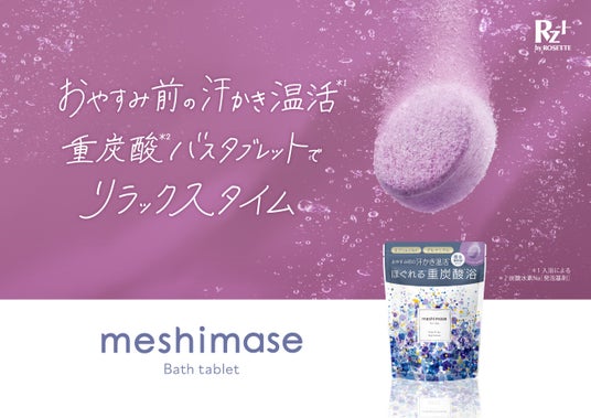 ロゼット株式会社(本社:東京都品川区、代表取締役社長:藤井 敬二)が展開する『Rz+ by ROSETTE』(アールゼットプラス バイ ロゼット)のボディケアブランド『meshimase(メシマセ)』から、こころやすらぐ*2重炭酸*3入浴料「meshimase バスタブレット スパ リラックス」を数量限定で発売いたします。