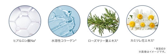 ヒアルロン酸Na*6、水溶性コラーゲン*6、ローズマリー葉エキス*6、カミツレ花エキス*6を配合。
