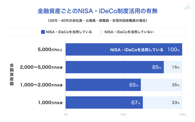 金融資産額が2,000万円から5,000万円未満の人は、NISA・iDeCoを活用している人の割合が「85%」、5,000万以上の人の割合は「100%」でした。金融資産額が多い人はNISAやiDeCoの利用率も高いことが分かります。このことから、制度の利用有無は金融資産額の多さに関係していると考えられます。金融リテラシーを向上することで、制度を理解し活用することにもつながります。